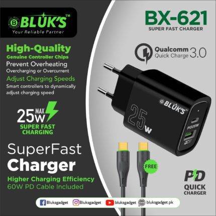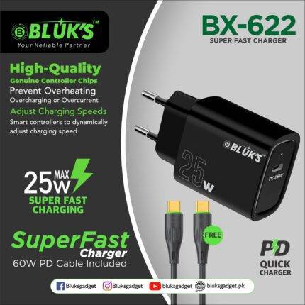 Original price was: ₨ 3,499.₨ 1,749Current price is: ₨ 1,749.Bluks BX-622 25W Fast Charger With USB-C To C Cable – 2025 Edition