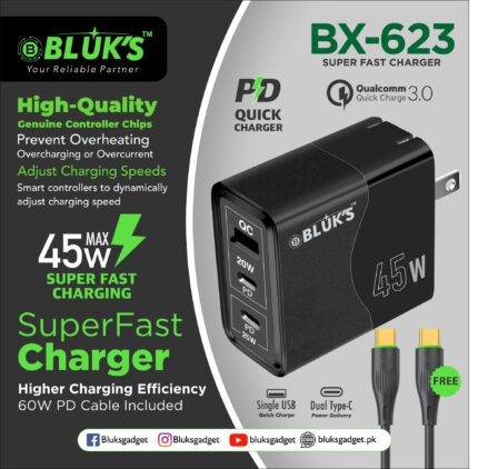 Original price was: ₨ 3,199.₨ 1,599Current price is: ₨ 1,599.Bluks BX-623 45W Fast Charger With USB-C To C Cable – 2025 Edition