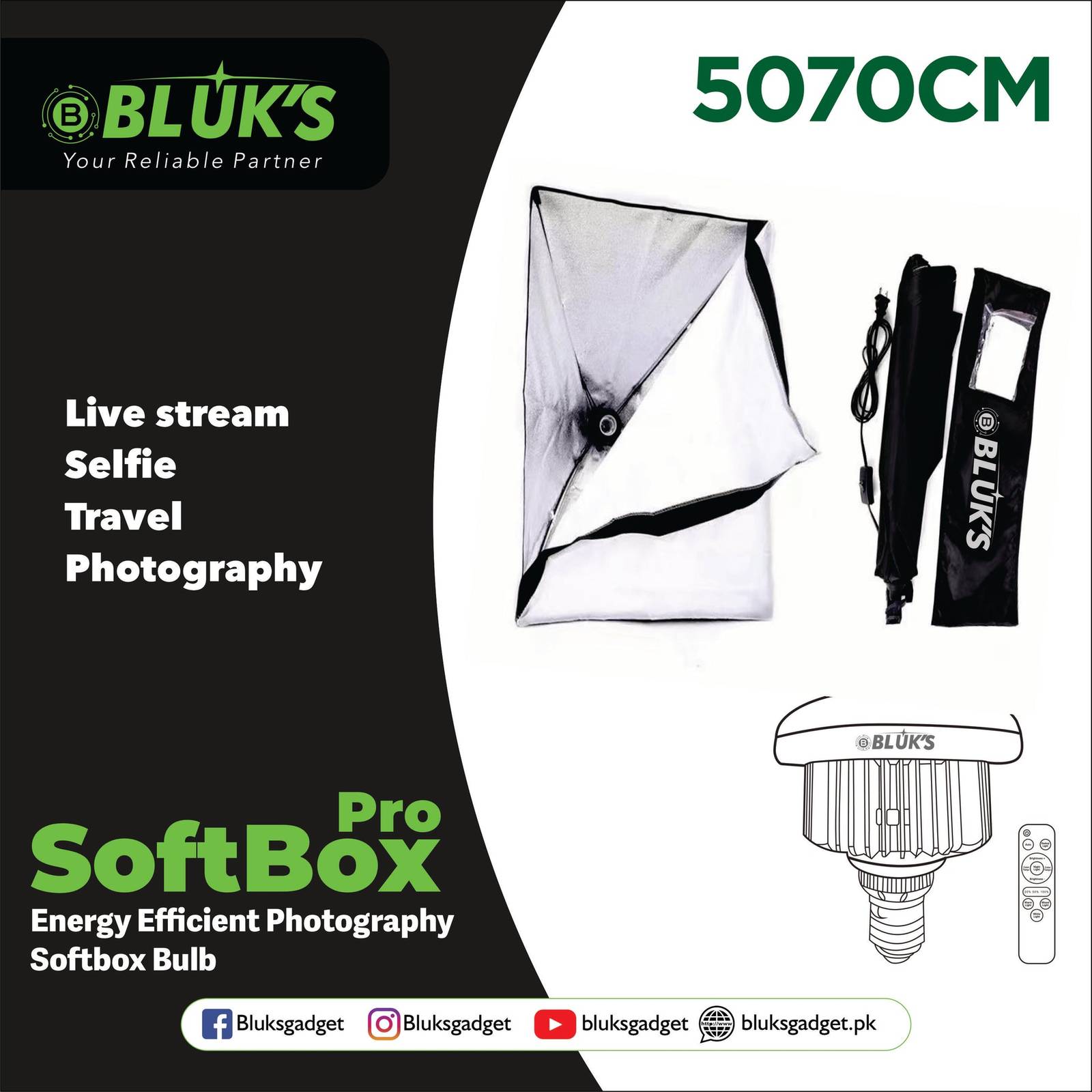 Introducing the Bluks 50x70CM Premium Umbrella for Photography, now available at an affordable price in Pakistan from Dynamite Accessories. This high-quality umbrella is a must-have for any photographer looking to enhance their lighting setup. Crafted with durable materials, this umbrella is designed to withstand frequent use in various shooting conditions. The large size of 50x70CM provides ample coverage and soft, diffused lighting for portrait, product, and studio photography. The premium construction ensures long-lasting performance, while the easy-to-use design makes it a versatile tool for photographers of all levels. Elevate your photography game with the Bluks Premium Umbrella and capture stunning images with ease.