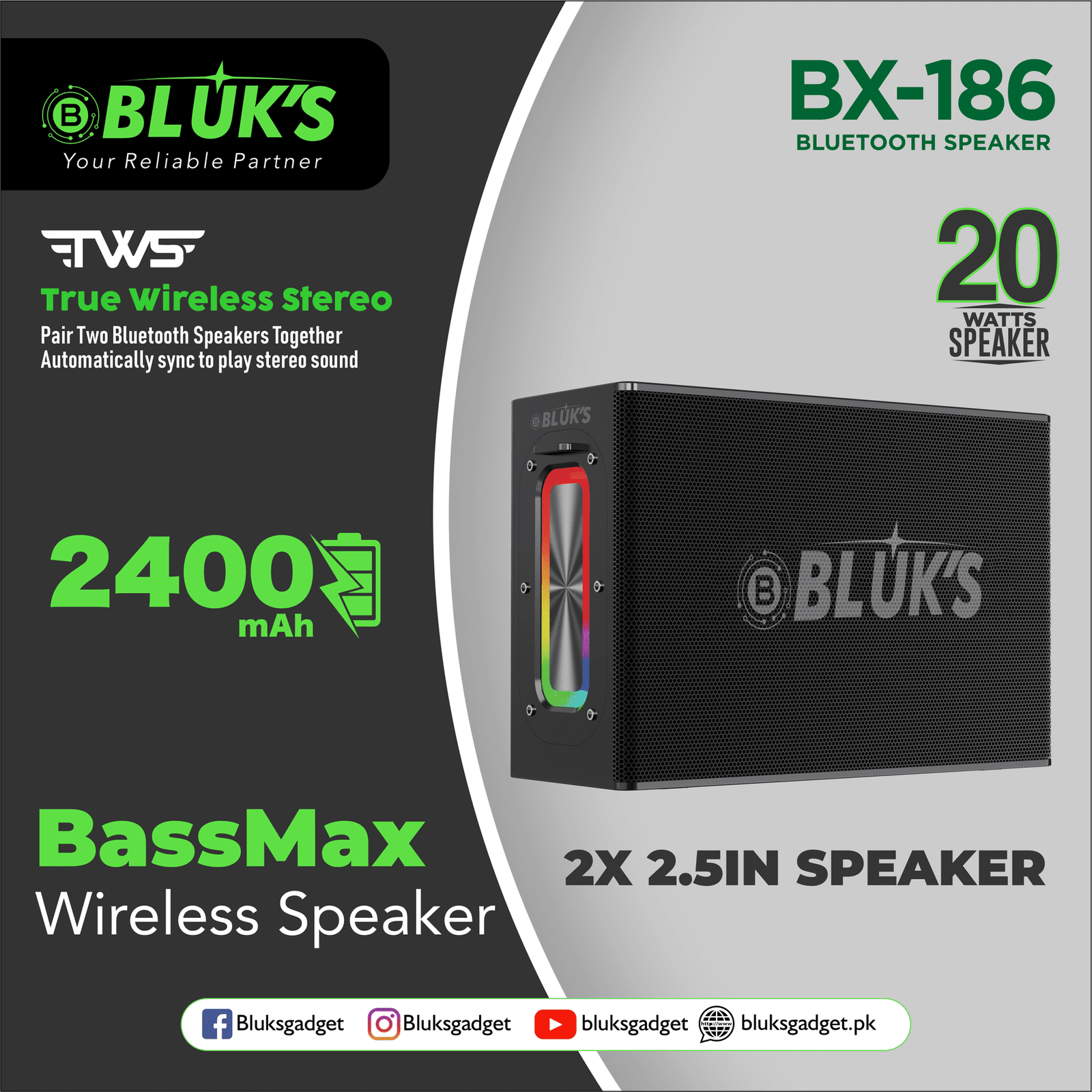 Home > Shop > Best Wireless Earbuds Price in Pakistan > Bluks BX-186 Bass Max Wireless Bluetooth Speaker | 2025 Edition