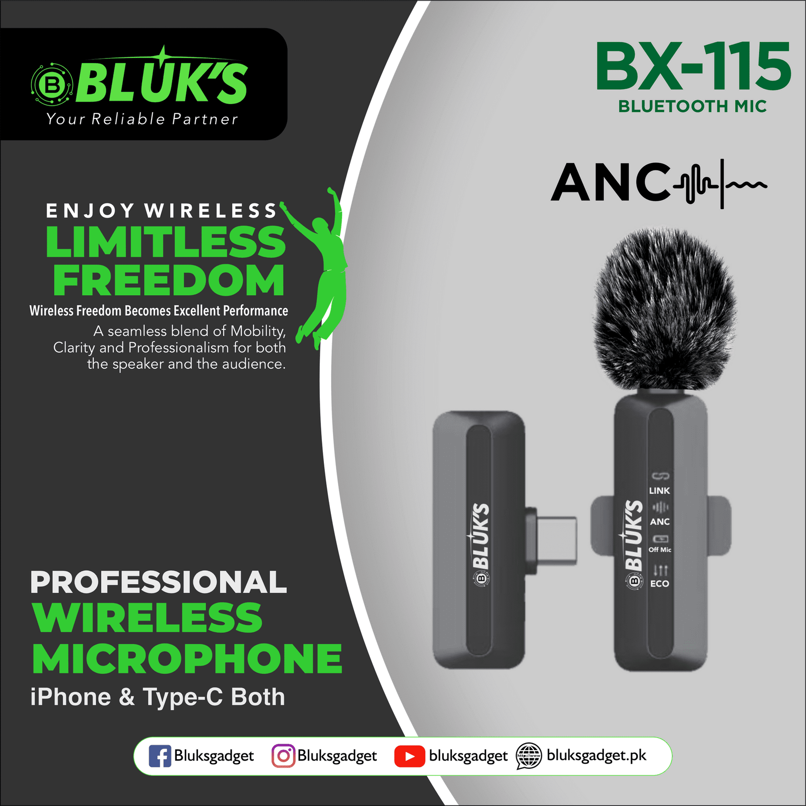 Introducing the Bluks BX-115 Wireless Bluetooth Microphone – 2025 Edition, now available at an affordable price in Pakistan through Dynamite Accessories. This cutting-edge microphone offers crystal-clear sound quality and seamless connectivity, making it perfect for karaoke nights, live performances, podcasts, and more. The 2025 Edition features advanced noise cancellation technology, a sleek and ergonomic design, and a long-lasting battery life for extended use. With easy Bluetooth pairing and compatibility with all devices, this microphone is a must-have for any music enthusiast or content creator. Elevate your audio experience with the Bluks BX-115 and order yours today from Dynamite Accessories!